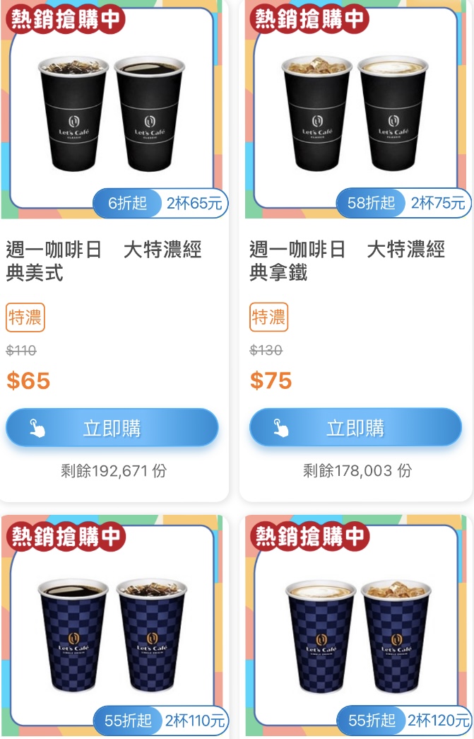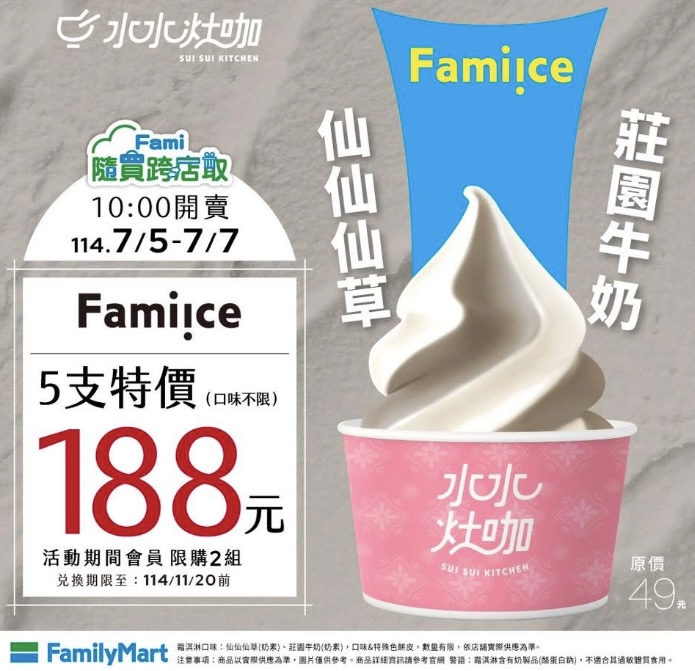週一也要享用咖啡優惠,全家便利商店的大杯單品咖啡、大杯特濃美式咖啡都有第二杯10元的優惠,單品拿鐵與特濃拿鐵也同步有優惠,可使用隨買跨店取購入,方便寄杯,每品項每人可購入兩組為限,優惠只有一天快把握!另有與水水灶咖合作的冰淇淋新口味仙仙仙草冰淇淋推出5支188元的嘗鮮優惠!