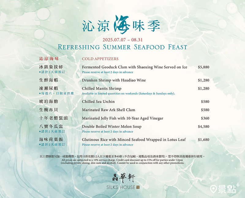 「沁涼海味季」全系列菜色即日起於晶華軒午、晚餐時段供應,單點價格360元起。