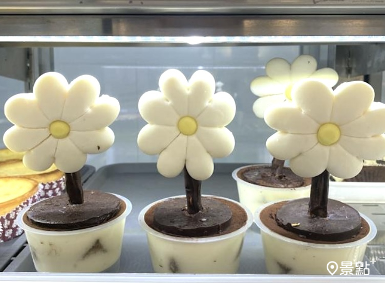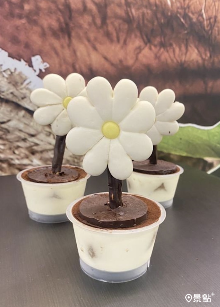 「小花蛋糕」是以饅頭製成圓弧形狀的花瓣,加上瑞典巧克力椒鹽點心棒作為花柄支架,底座的盆栽則是提拉米蘇,推薦粉絲看演唱會前先吃一波!