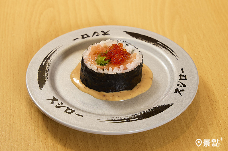 「辣味美乃滋鮭魚卷60元」在壽司卷中豪邁包裹鮭魚肉片,佐以韓式辣醬美乃滋與飛魚卵點綴,創意融合日韓風味,香辣中帶出鮭魚鮮美,層次豐富。