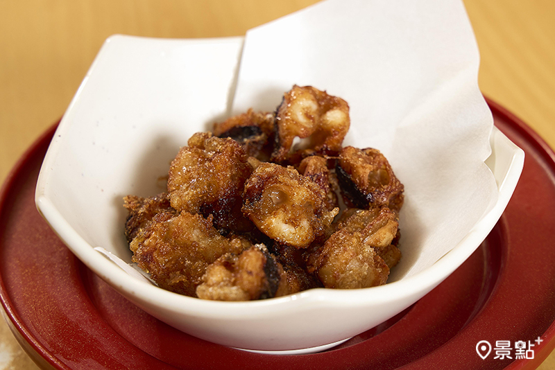 「酥炸醬醃北魷軟骨90元」每隻魷魚僅能取得一塊稀有的頭部軟骨,以醬油醃漬入味後於店內現炸,味道鮮美、口感強勁,絕對不容錯過。