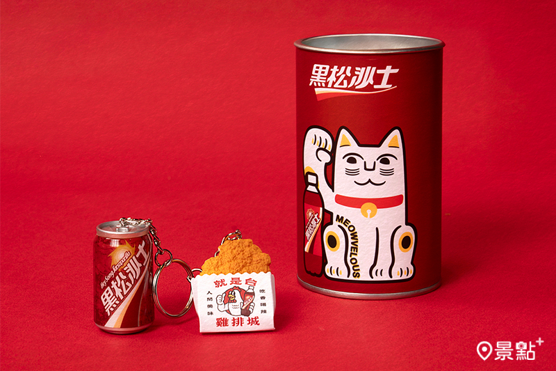 黑松沙士×貓下去不僅推出「就是台 雞排城」聯名套餐,還大玩台味潮流元素,將國民飲料「黑松沙士」與台灣靈魂小吃「雞排」,搖身一變成超萌的微縮吊飾,將迷你版台灣經典小吃組合掛在包包上、鑰匙圈上,不只展現獨特個性,更可以是彰顯「台味時尚」的潮流標誌。