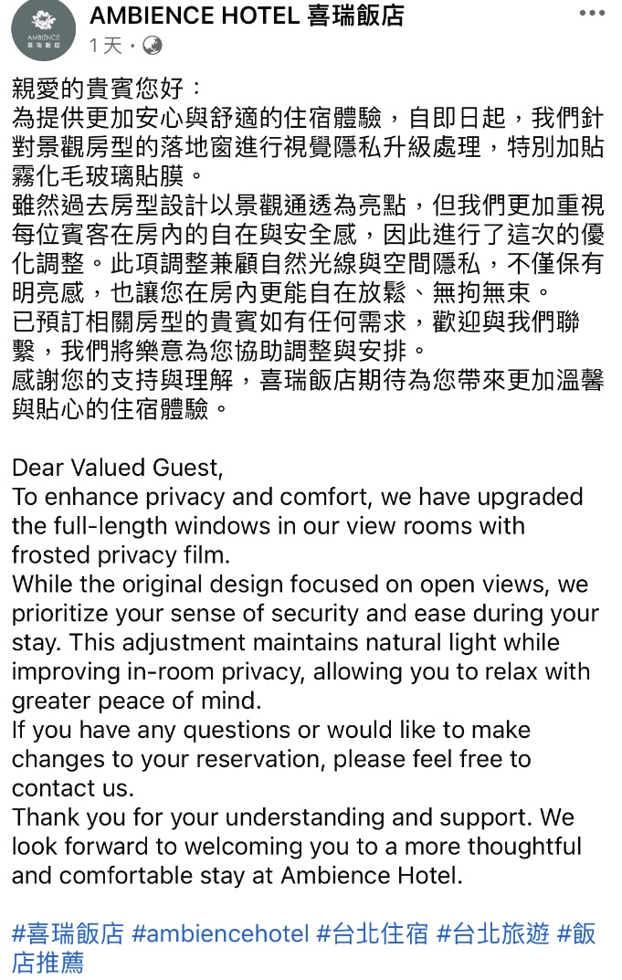 親愛的貴賓您好: 為提供更加安心與舒適的住宿體驗,自即日起,我們針對景觀房型的落地窗進行視覺隱私升級處理,特別加貼霧化毛玻璃貼膜。