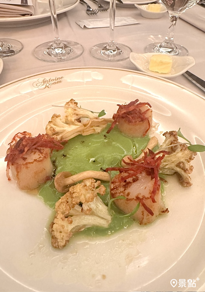開胃菜的部分也有多道清爽推薦,帶有法餐優雅風格的擺盤也讓人是絕有所享受,包括「干貝青花菜泥」使用北海道生食級干貝煎香,以青花菜泥鋪底點綴上炭烤白花椰、百靈菇與辣味香腸,呈現出層次豐富的鮮味花園。
