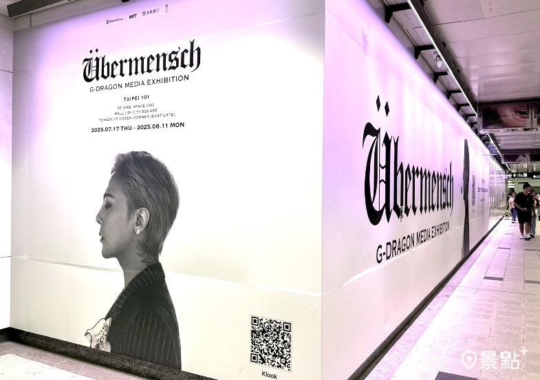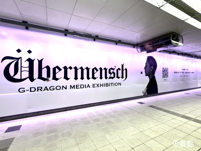 在捷運台北101站4號出口通往台北101地下連通道的通行道中,有一處布置了GD媒體藝術展的巨幅看板,白色為主要底色,吸引許多經過的粉絲停駐下來拍照、合影,這處看板不需進站就可拍照,很推薦到台北101拍小雛菊、逛展的粉絲也可以到這裡拍照。