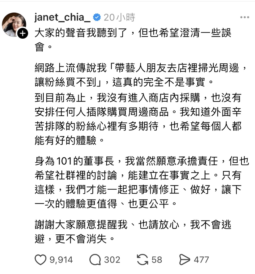 由於GD媒體藝術展引發的爭議,讓台北101董事長賈永婕也成為粉絲抱怨的對象,賈永婕也在個人社群上作出澄清與說明,更進一步說明並無帶藝人朋友去購買周邊商品等事件,她也認為「希望社群裡的討論,能建立在事實之上,只有這樣,我們才能一起把事情修正、做好,讓下一次的體驗更值得、也更公平。」