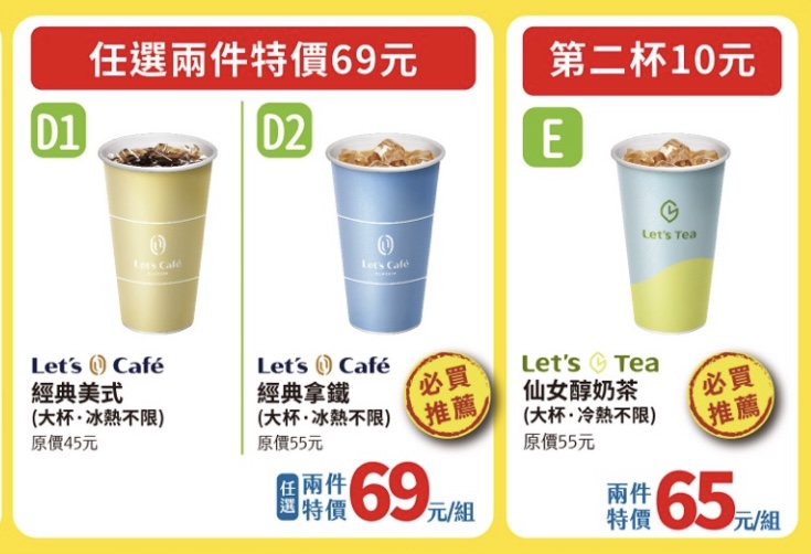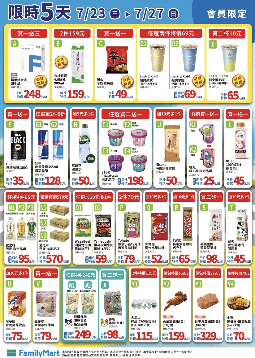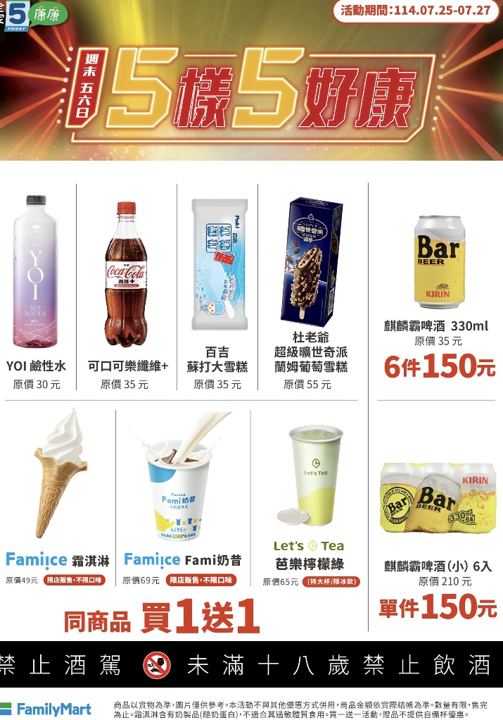 週五開始全家便利商店「康康5」有冰淇淋、冰棒、奶昔、芭樂檸檬綠等消暑商品買1送1優惠,而週三起跑的會員優惠,除了有31冰淇淋買二送一,還有韓國辛拉麵泡麵等多種商品有買一送一優惠外,仙女醇奶茶有第2件10元直逼買一送一的優惠!Let's Cafe經典美式與經典拿鐵有「兩件商品享優惠」的折扣,兩件69元,值得注意的是過去Let's Cafe的品項都是第二件10元(即65元、75元),自近期一度拉高第二件的金額,本週稍微回降,以拿鐵來說相當於第二杯14元,美式咖啡就是第二杯24元。