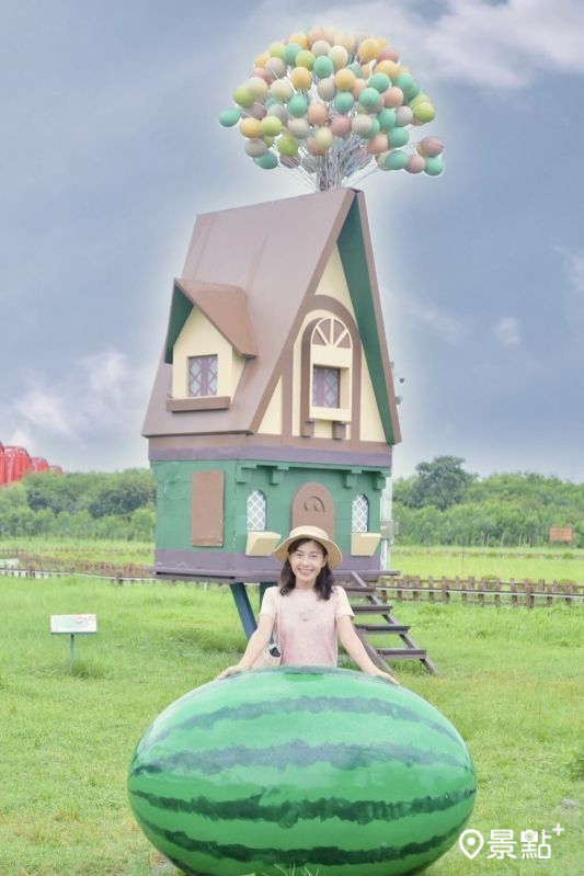 其中最吸睛的是電影《天外奇蹟》中的飛天氣球小屋「夢想起飛」,精緻可愛的小屋造景搭配紅橋、草地和藍天白雲,讓人宛如置身童話世界,小屋前方及公園小路上則設有巨型西瓜造景「啾C吸瓜椅」。