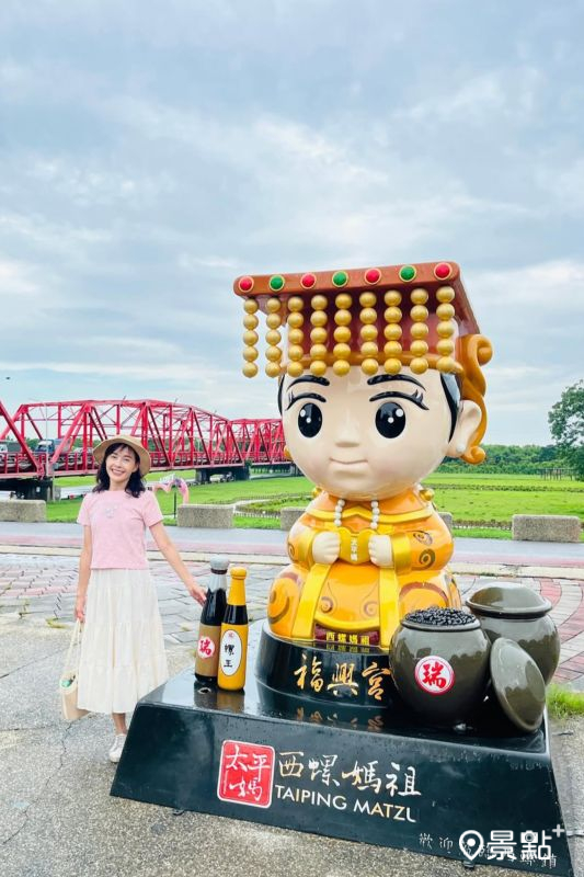 園內也設有一隻6米高的大象,鼻子上頂著大大的愛心代表著「印象西螺」,以在地文化結合人文特質、自然美景,打造出吸睛的藝術作品,此外,還有風車同框「西螺三金」、巨型玫瑰「鐘聲幸福」、地標造景「我愛西螺」及「Q版媽祖」等打卡亮點。