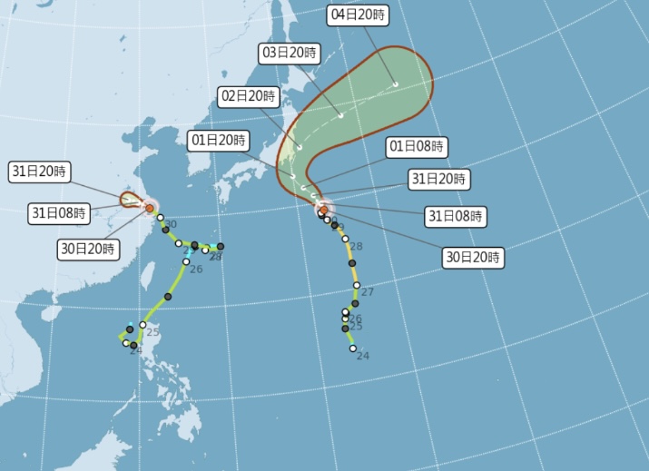 輕度颱風編號第2509號颱風(國際命名KROSA,中文譯名:柯羅莎),中心氣壓988百帕,30日14時的中心位置在北緯29度,東經143.2度,即在硫磺島北北東方500公里之處(臺北東北東方2190公里之處),以每小時6轉9公里速度,向北北西進行,中心附近最大風速每秒23公尺(即每小時83公里),相當於9級風,瞬間最大陣風每秒30公尺(即每小時108公里),相當於11級風,7級風暴風半徑100公里,預測31日14時的中心位置在北緯30.2度,東經142.7度,即在硫磺島北北東方620公里之處(臺北東北東方2160公里之處)
