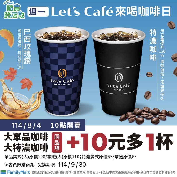 週一咖啡日超商推出的咖啡優惠把握起來,整個禮拜的咖啡錢更划算,全家便利商店推出的大杯特濃咖啡、大杯單品咖啡加10元多一杯,拿鐵品項也同樣有這樣的優惠,而且可以線上寄杯,每個品項可買兩組,兌換期限至9月31日,優惠折扣程度直逼買一送一;7-11則有指定咖啡品項兩杯99元的優惠,霜淇淋不限口味買2送2,快揪好同事、好朋友一起分享。