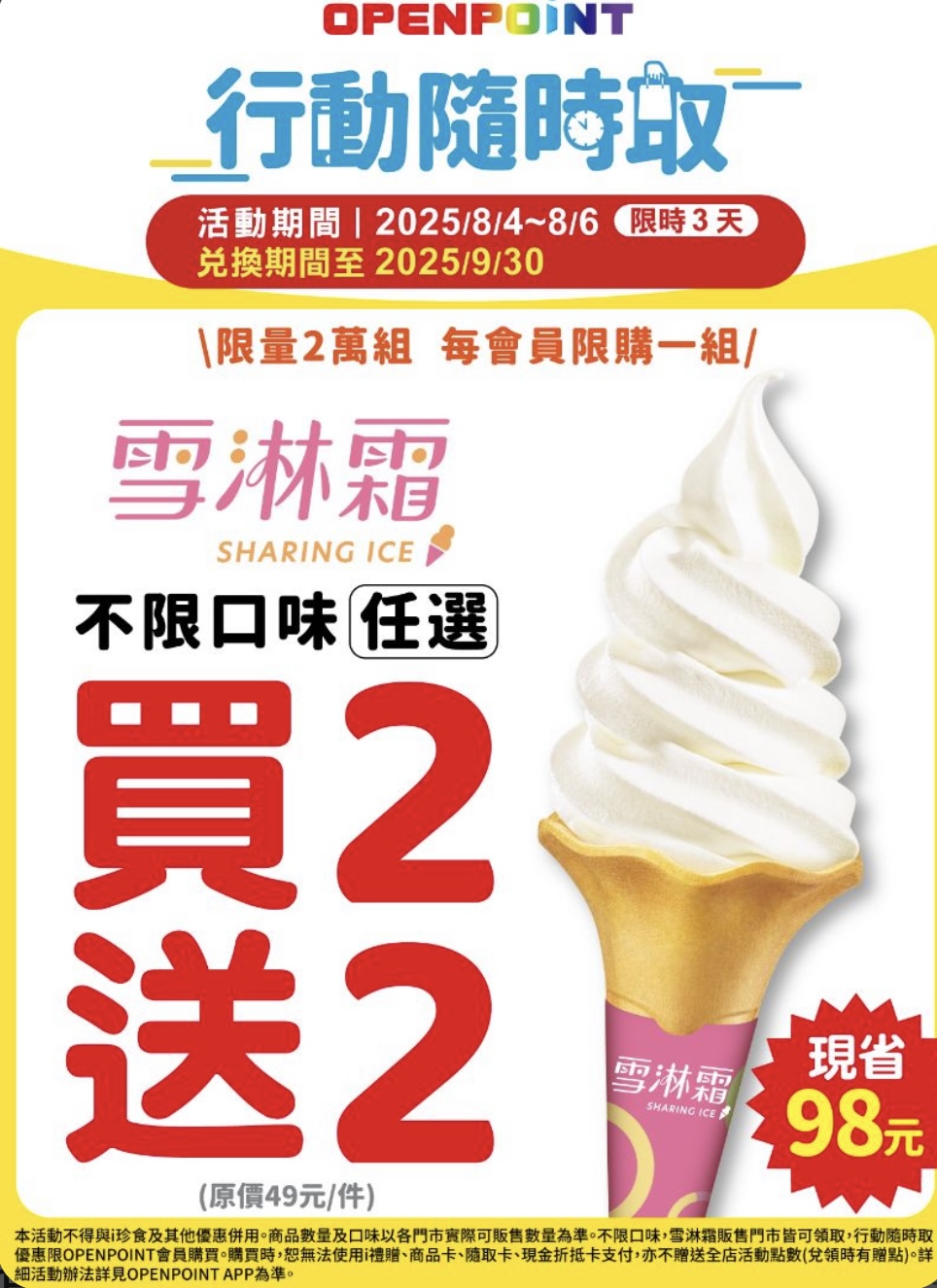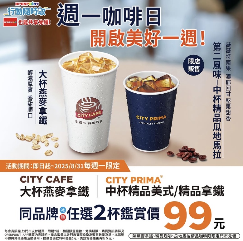 7-11週一咖啡日的優惠品項為CITY CAFE大杯燕麥拿鐵、CITY PRIMA中杯精品美式/精品拿鐵,可透過行動隨時取購買,此外,7-11雪淋霜不限口味買2送2限時登場,8月4日到6日一樣用行動隨時取購入,可囤貨慢慢取用。