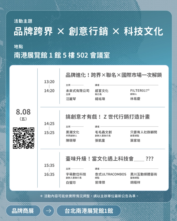 逛完心儀的攤位以後,還可以參加論壇活動繼續與專家對談。今年邀集日本三麗鷗、華納兄弟、臺灣原創IP品牌及跨界專家,深度解析角色IP跨域變現全攻略、創意行銷、科技文化等多面向主題,探討文創產業創新路徑及策略。