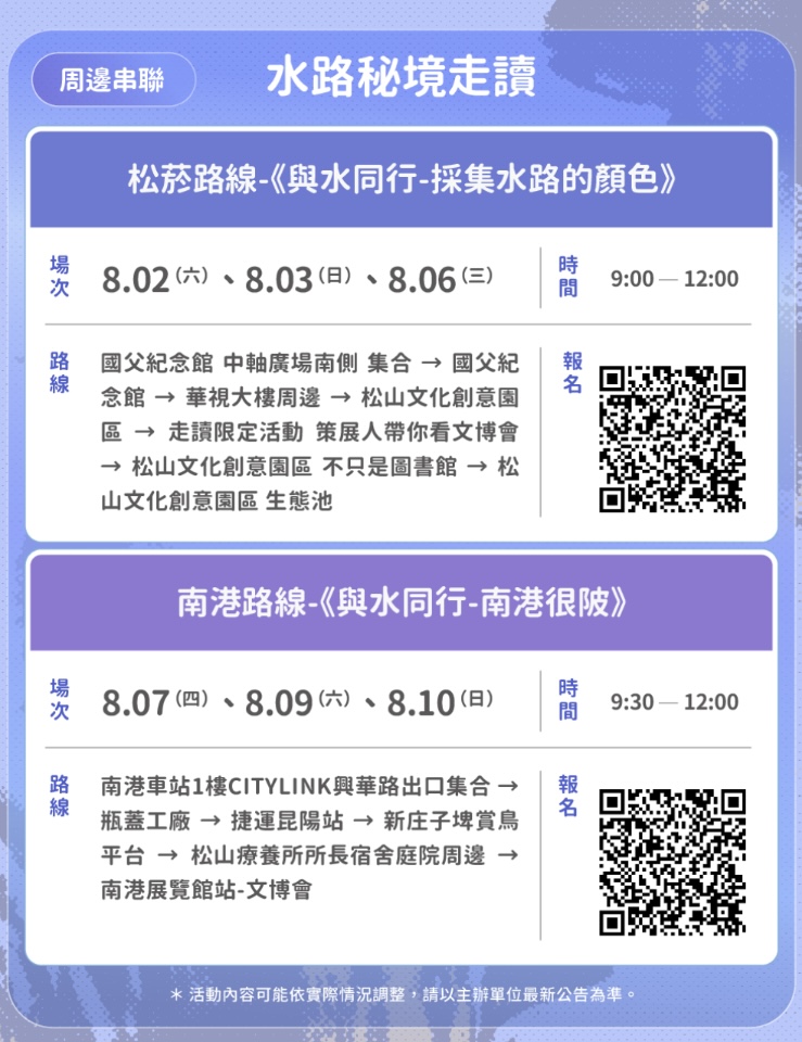 兩大展區於展期間推出「走讀導覽」,包括松菸路線「與水同行—採集水路的顏色」及南港路線「與水同行—南港很陂」,穿行探索瑠公圳遺跡、昔日菸廠澡堂秘境、濕地生態及水路痕跡,由在地專家深度解說,帶領民眾一探臺北水文歷史脈絡,並邀請策展人專場導覽文博會展區,懶人行程免規劃,由專家帶領全部體驗,相關報名資訊可參考活動官方網站。