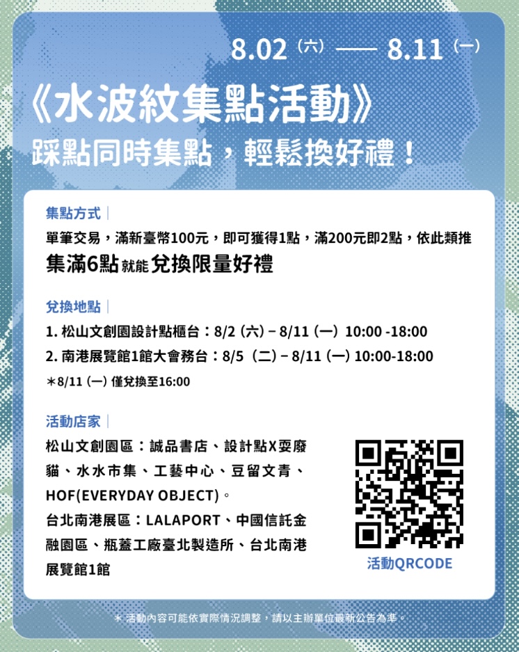文博會與展區周遭的指定串聯商家共同舉辦「水波紋集點活動」,只要在指定主題店家消費集點,集滿點數即可兌換限量文博會周邊商品,邀請民眾不只看展走逛,更走進展區鄰近街區;而炎炎夏日來一杯文博會與大苑子攜手推出限定聯名飲品「巨峰葡萄冰茶」,不僅杯身設計融合主視覺「水風景」與新銳 IP「BIBI波波」,水果和冰茶更創造視覺與味覺的雙重享受。