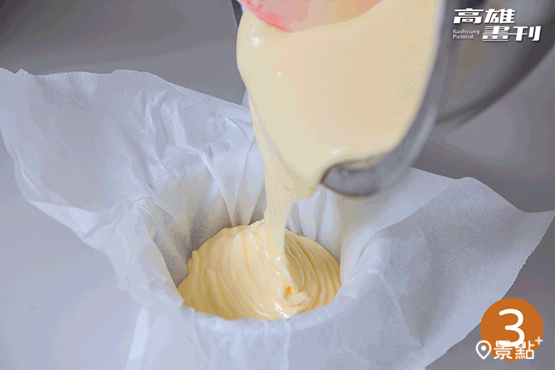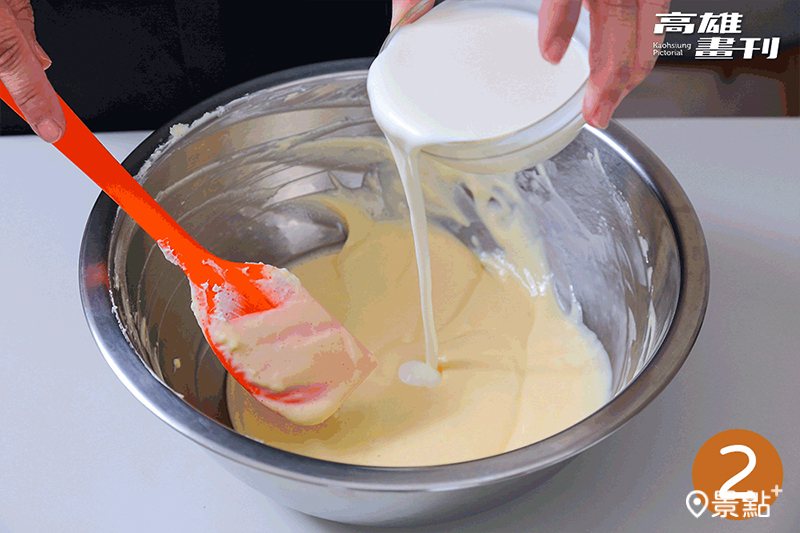 2、分次加入雞蛋、玉米粉、鮮奶油,拌至滑順無顆粒。