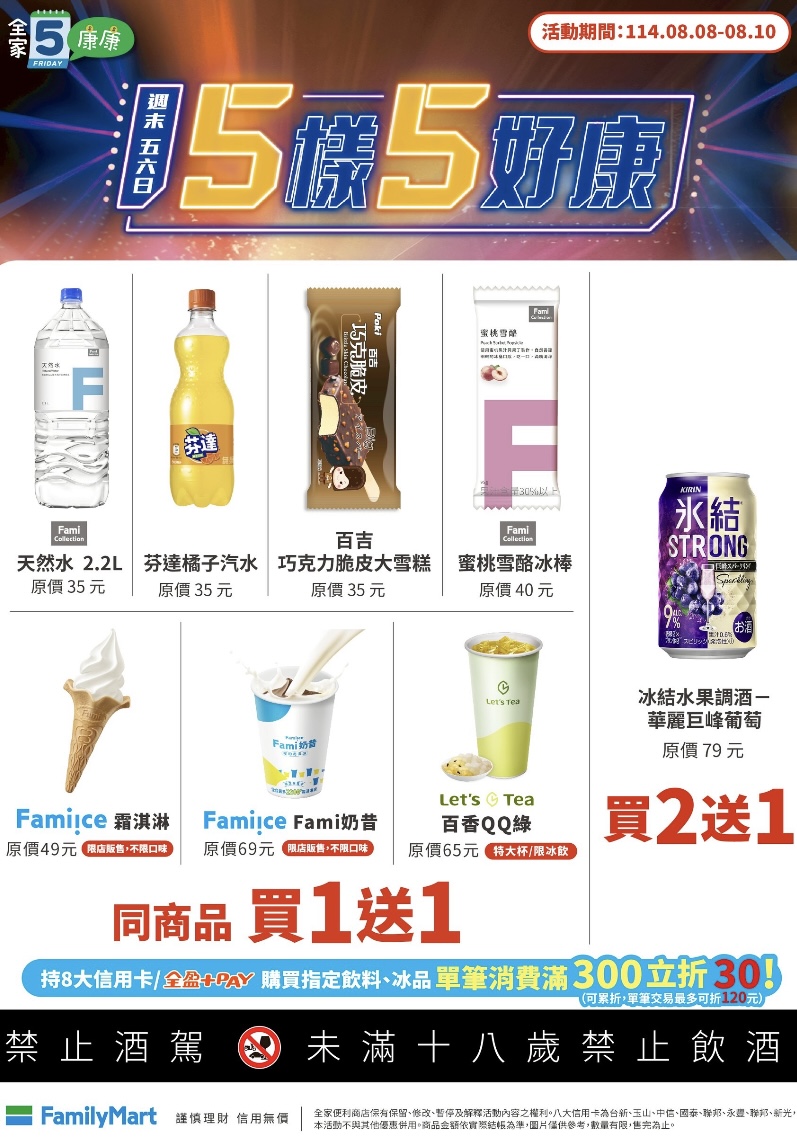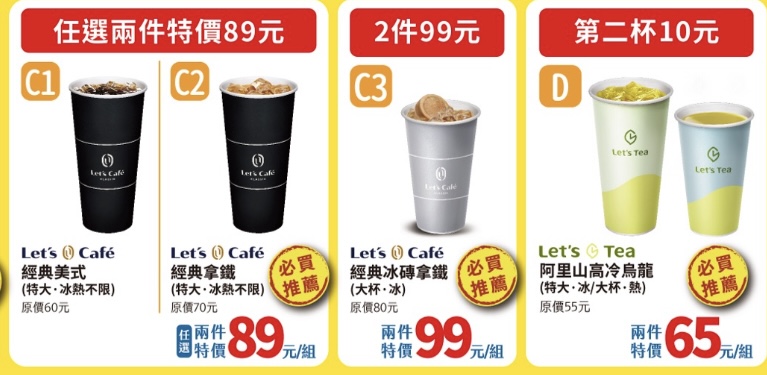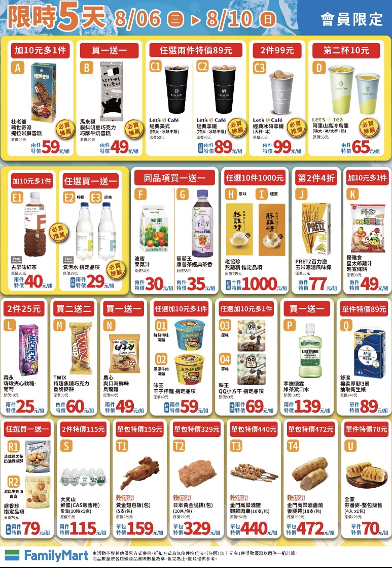 週五開始全家便利商店「康康5」有冰淇淋、冰棒、奶昔、百香QQ綠等消暑商品買1送1優惠,而週三起跑的會員優惠,除了有農心海鮮拉麵泡麵等多種商品有買一送一優惠外,馬來貘巧克力牛奶雪糕有買一送一優惠,阿里山高冷烏龍有第2件10元直逼買一送一的優惠!Let's Cafe經典美式與經典拿鐵「兩件商品享優惠」89元,值得注意的是過去Let's Cafe的品項都是第二件10元,這一個月以來優惠調整較為縮水。