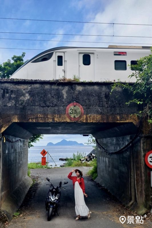 取景完近距離畫面後,可到遠一點的位置拍攝橫幅全景;接著到面向龜山島的涵洞取景,以直幅構圖、捕捉火車從上方駛過的獨特畫面;最後可在涵洞以平視角度及橫幅構圖拍攝,拍出宛如擁有畫框般的龜山島海景。