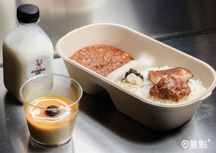 現場提供4款CURRY UP經典餐點:牛筋咖哩、蝦紅咖哩、雞末咖哩以及蔬食咖哩,每一道皆使用品牌標誌性的熟成咖哩醬,搭配白飯與配菜,體現「簡單但講究」的風格哲學。全品項皆為外帶形式。