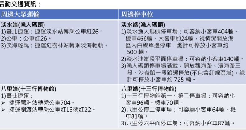 漁人碼頭港區內停車場煙火秀當日(8/10、17、24)自上午10點起採進場一次性收費(小客車90元/次),無30分鐘免費優惠;港區內停車場滿載時,將禁止車輛進入漁人碼頭,並開放港區外圍部分道路(觀海路、濱海路三段、沙崙路一段)路邊停車(不包含紅線區域),請依現場員警、義交指引至路邊停放;另漁人碼頭港區外還有計時收費的淡水沙崙段平面停車場供民眾停車。