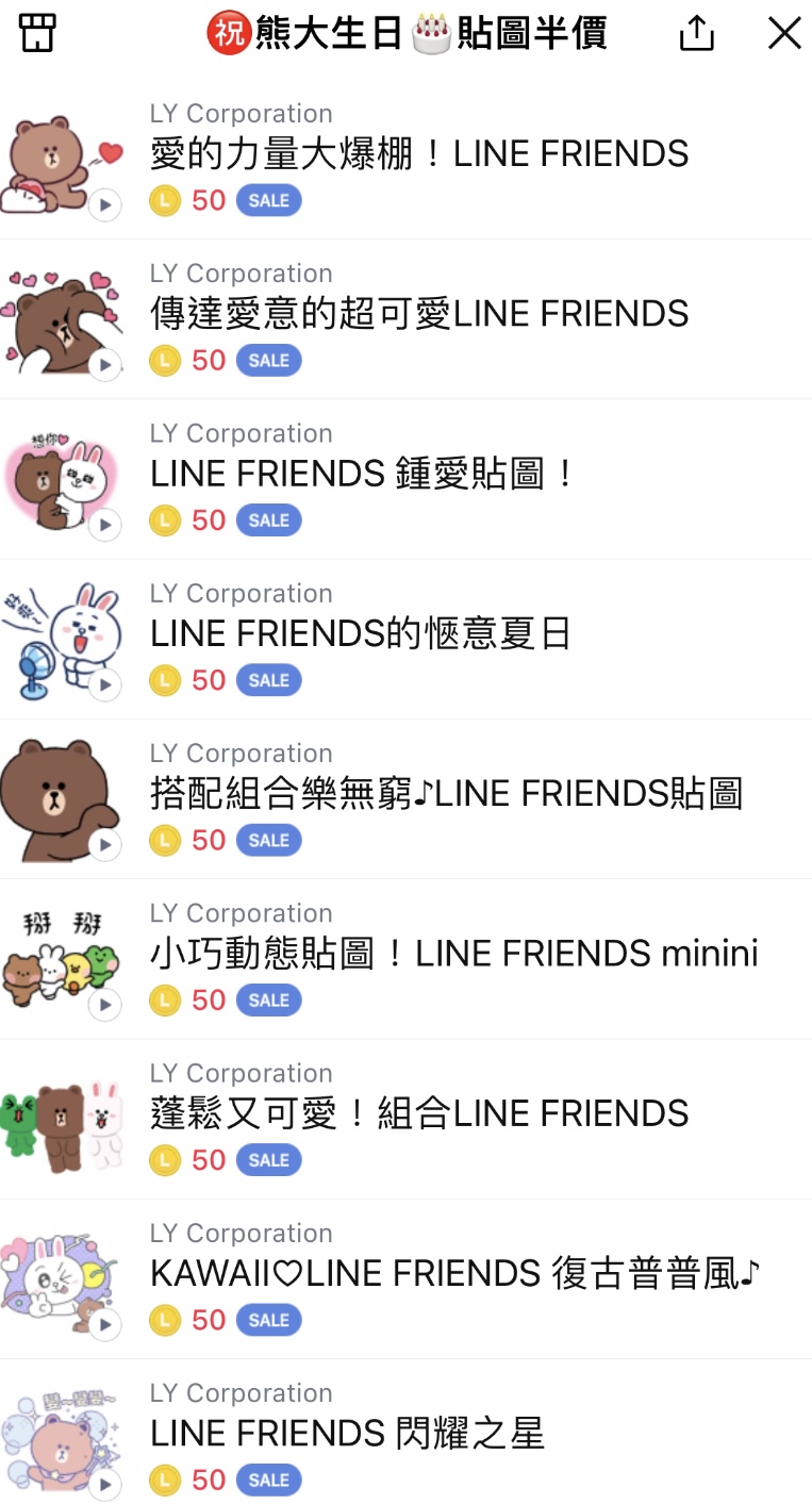 適逢熊大生日慶(生日是8月8日),自8月8日到8月11日LINE貼圖推出以熊大為主的LINE FRIENDS貼圖半價,其中包括與兔兔一起設計的動態貼圖,還有LINE FRIENDS minini系列的貼圖等共9款貼圖有5折的優惠,由於LINE FRIENDS貼圖優惠機會不多,喜愛熊大的粉絲要趕快把握時間入手半價貼圖!
