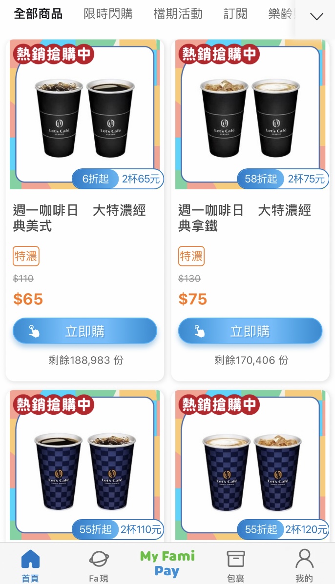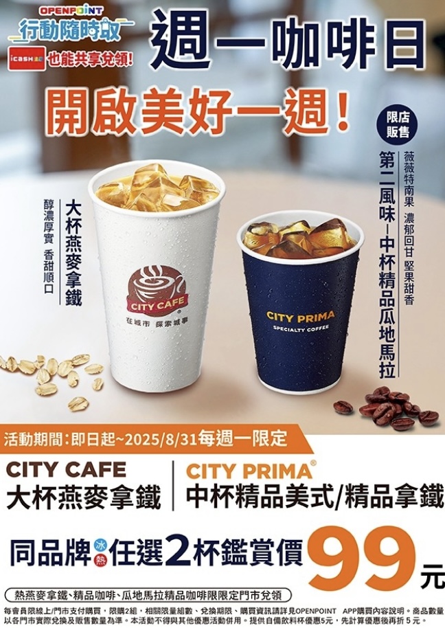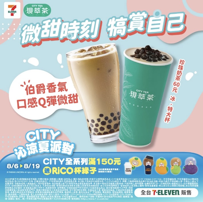 週一咖啡日超商推出的咖啡優惠把握起來,整個禮拜的咖啡錢更划算,全家便利商店推出的大杯特濃咖啡、大杯單品咖啡加10元多一杯,拿鐵品項也同樣有這樣的優惠,而且可以線上寄杯,每個品項可買兩組,兌換期限至9月30日,優惠折扣程度直逼買一送一;7-11則主推「CITY TEA 珍珠奶茶」,且CITY系列飲品滿額送RICO杯緣子。
