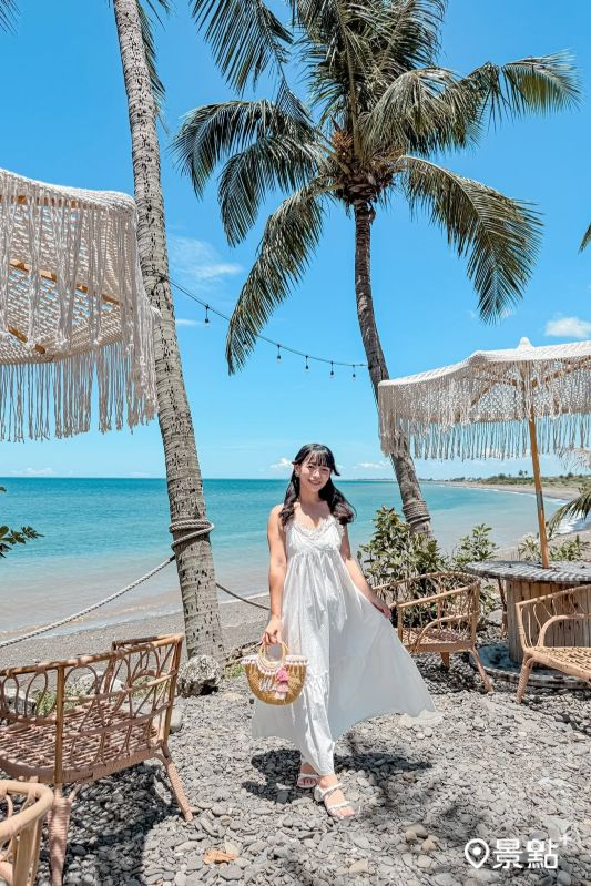 「Coconut Coast 椰海·漫漫」地點位於屏東縣枋山鄉,是一間擁有海景第一排視野的日落餐廳,戶外座位區設有藤編桌椅、木質圓桌搭配流蘇遮陽傘點綴,與搖曳的椰子樹、湛藍海景相映成趣,讓人宛如置身南洋海島度假勝地。