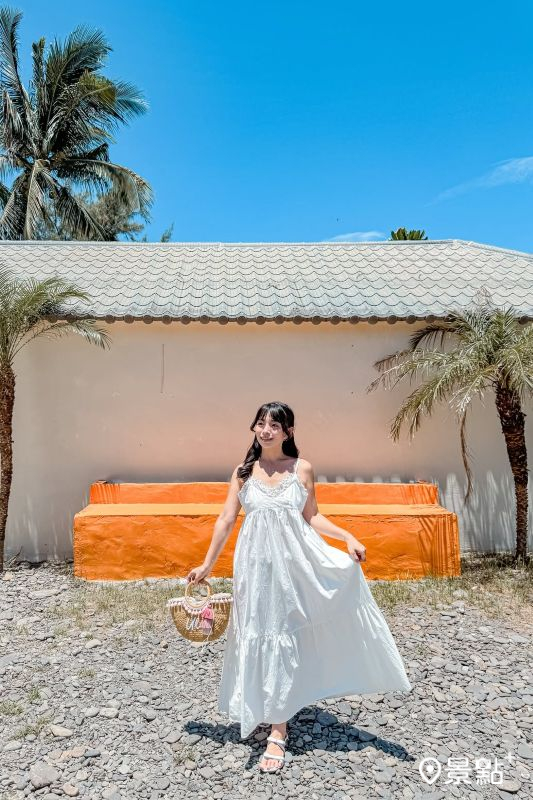 除了戶外區外,店家也提供包廂區,怕曬太陽的旅人可以選擇在涼亭或遮蔽區域用餐。取景時不僅要捕捉海景第一排畫面,也可以與店內充滿異國風情的矮牆建築同框,或是搭配路牌、桌椅等元素,拍攝偽出國美照。