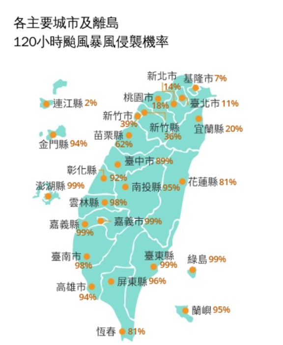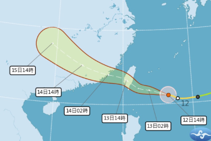 颱風及其外圍環流影響,明(13)日臺東縣(含蘭嶼、綠島)局部地區有平均風12級以上或陣風14級以上發生的機率(紅色燈號),彰化縣、雲林縣、嘉義縣、臺南市、高雄市、屏東縣、花蓮縣、澎湖縣局部地區有平均風9級以上或陣風11級以上發生的機率(橙色燈號),基隆市、臺北市、新北市、桃園市、新竹市、新竹縣、苗栗縣、臺中市、南投縣、嘉義市、宜蘭縣、金門縣、連江縣局部地區有平均風6級以上或陣風8級以上發生的機率(黃色燈號),請嚴加防範。