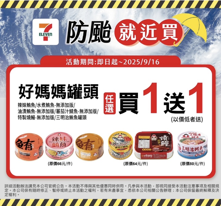 罐頭買一送一來一客泡麵飯糰全品項每朝健康囤貨!颱風來襲7-11防颱優惠即刻推出