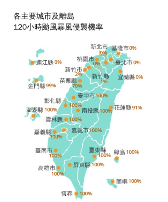 【橙色燈號】 基隆市、新北市、桃園市、臺中市、南投縣、雲林縣、嘉義縣、臺南市、高雄市、屏東縣、臺東縣、花蓮縣、宜蘭縣、金門縣。