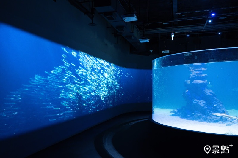 1F-黑潮之海:緩緩步下樓梯,彷彿游入黑潮的巨大洋流中。台中海洋館帶領民眾跟著黑潮的豐富生態如大尾虎鮫等生物,搭配令人震撼的劇場式沉浸投影,近距離感受大海的壯麗。