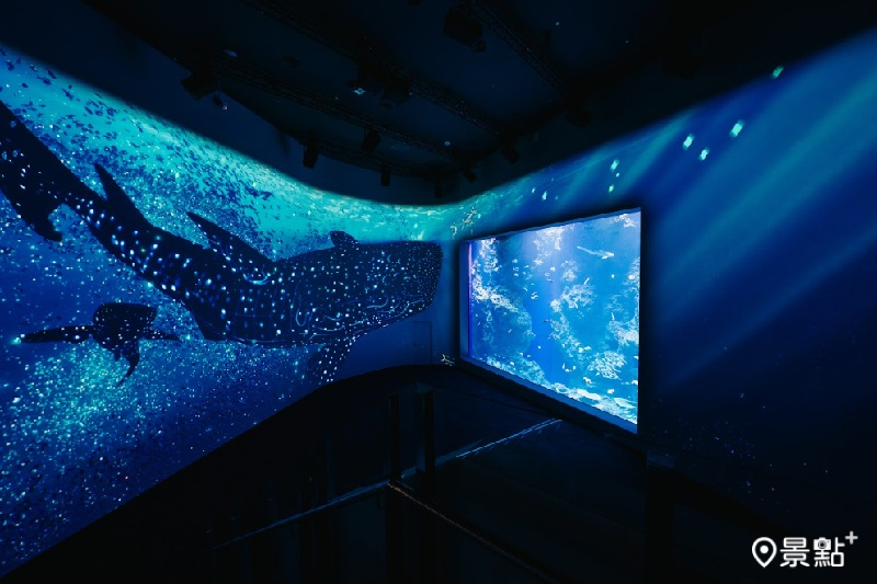 2F-鯊魚巡游:360度的全透明無邊際鯊魚展示缸,結合沉浸互動投影,將重塑遊客的視覺感官。鯊魚猶如漫游於幽藍深海中,參觀的民眾恍若潛行於大海中與其伴游;近距離觀察鯊魚優美的姿態與生物特徵,一圓與鯊共舞的美夢。