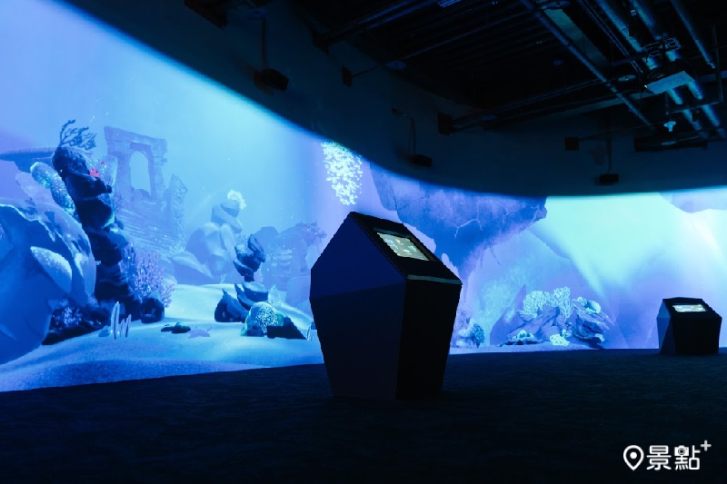 1F-海洋學園:旅程的最終站,讓大小朋友在參觀之後,藉由全景互動投影,學習更多海洋生物知識,也提供更多親子一同參與的共學樂趣。