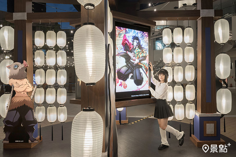 林口店打造多處沉浸式打卡亮點,其中Ⅰ館中央廣場「五柱燈庭‧心技映照之院」以日式燈籠交織出光影,消費者可轉動燈箱與五位「柱」合影。