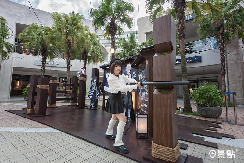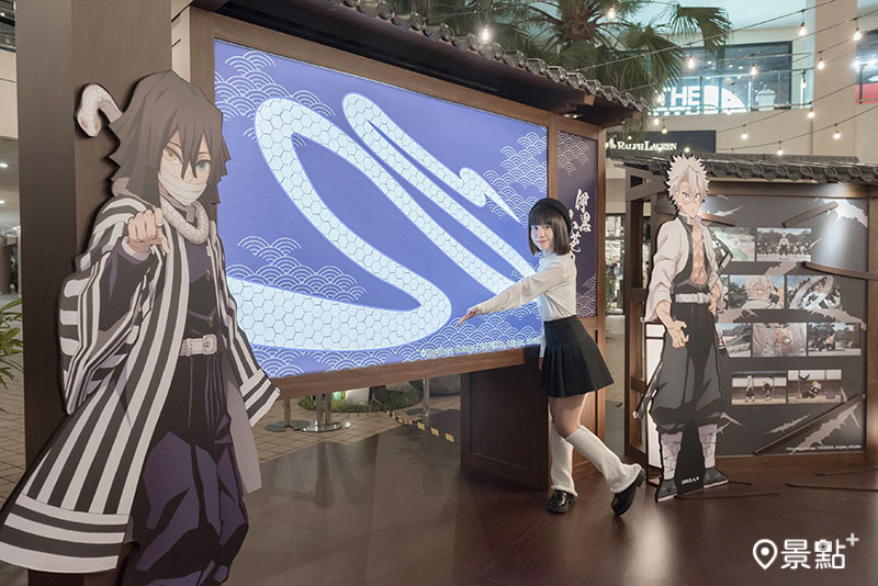 「風蛇修練場」呈現訓練場景,消費者能模仿風柱揮刀挑戰,看看是否能精準擊中木樁凹槽,也能感受蛇柱的靈巧身法!