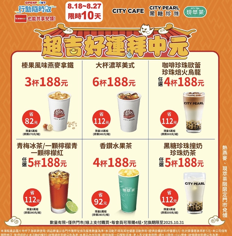 (備註:現萃茶、熱燕麥咖啡僅能於限定門市兌領。行動隨時取同品項、同規格及同價位可冰熱互換,兌領期限、限量及會員限購組數,請見OPENPOINT APP說明。)