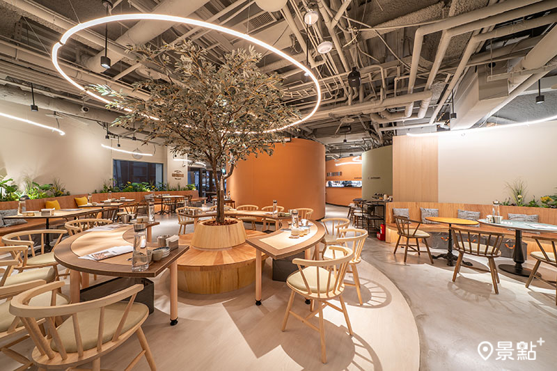 在台北小巨蛋第一排的GUMGUM EGG,延續小巨蛋的蛋形設計為概念,藉以大地色系、弧線勾勒起用餐空間,「小巨蛋是人工建築,對我們來說比較冷色調,為此我們用了柔和的大地色,讓消費者進來GUMGUM EGG就能感受到自然真實的輕鬆氛圍。」