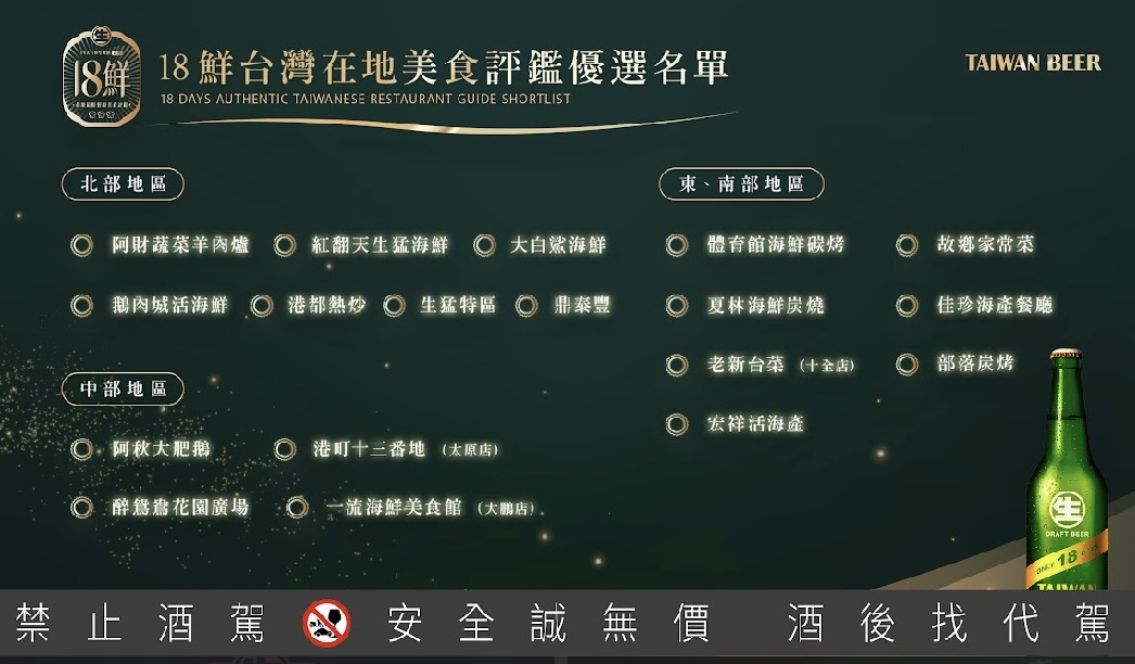 「18鮮」台灣在地餐廳美食評鑑入選名單於記者會現場正式公開,包括鼎泰豐、台北鵝肉城活海鮮、阿財蔬菜羊肉爐、阿秋大肥鵝、嘉義體育館海鮮碳烤、台南夏林海鮮炭燒、屏東佳珍海產餐廳、台東部落碳烤等代表性店家,展現台灣從北到南、從在地碗盤到大菜桌席的飲食多樣性。台啤表示:「我們希望透過18鮮,對台灣味深度致敬,把這些真正在地的味道帶上國際舞台。」