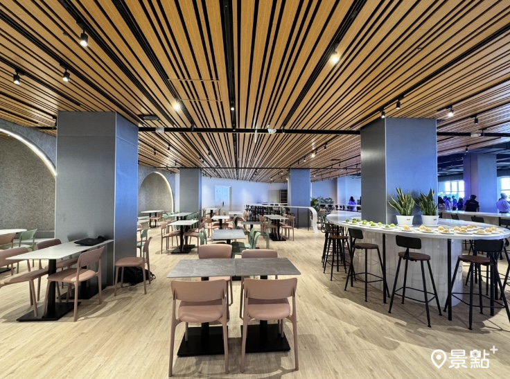 人工濕地旁就是餐飲空間,簡潔明亮的設計,彷彿一秒瞬移到網美咖啡館!