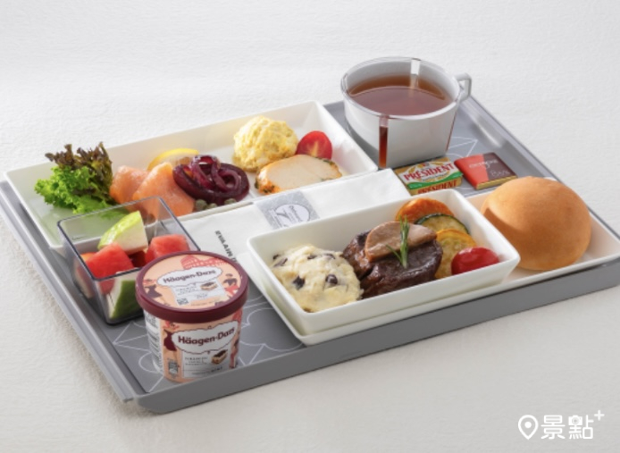 豪華經濟艙詮釋「顛覆性的價值升級」,主菜「嫩煎牛小排佐鵝肝慕斯及BBQ醬」,將經典法式料理重新演繹,融合柔嫩牛排與細緻鵝肝慕斯,復刻中世紀法國名菜的雋永風華,其中牛排料理主要是供應長程線的商務艙,此次特別於豪華經濟艙加碼推出,餐點更搭配長榮桂冠酒店精緻巧克力,讓旅客享受類商務艙的輕奢饗宴。