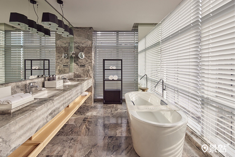空間設計取材北美實木與安格拉灰大理石,融合自然紋理與溫潤色系,如同回歸山海懷抱的沉靜情境。