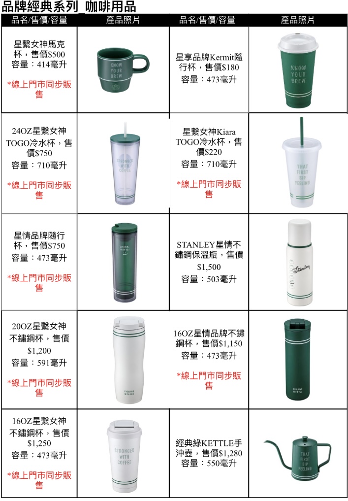 星巴克品牌經典系列,今年以簡約白搭配品牌綠,呈現純淨俐落的設計美學。全新設計系列於8月27日全門市和線上門市登場,涵蓋馬克杯、隨行杯、不鏽鋼杯(壺),以及手沖壺等多款商品。承襲星巴克獨特的手寫杯問候文化,融入精選咖啡生活標語,杯身印有「KNOW YOUR BREW」、「EVOLVING WITH YOU」、「THAT FIRST SIP FEELING」等字樣