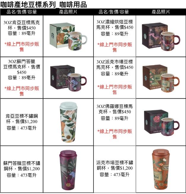 以星巴克咖啡豆包裝設計為靈感的「豆標系列」,全新推出 3oz 馬克杯與不鏽鋼杯,設計源於肯亞、蘇門答臘、派克市場與佛羅娜等經典咖啡產區。杯身細膩呈現各地咖啡原鄉的當地環境特色,賦予獨特的咖啡產地故事與收藏價值,8月27日上市。