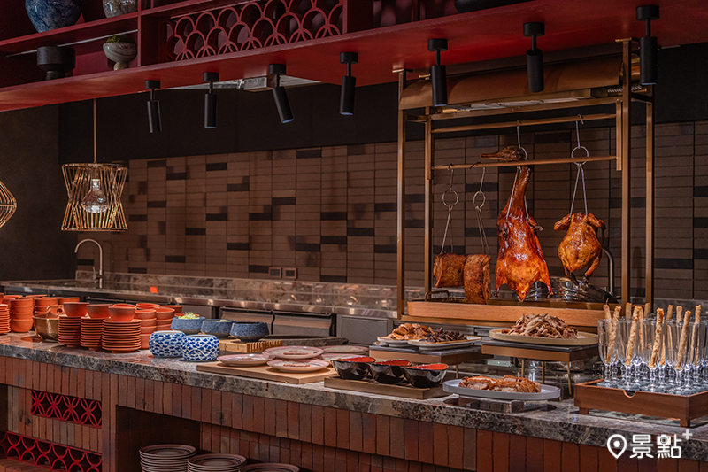 除了保溫鍋裡的中式餐點,以宜蘭櫻桃鴨為材料的京式片皮鴨包餅,已經成為島語菜色人氣王排行裡的前三名,燒臘師傅正統手法製作的脆皮燒腩,還有來自淨安牧場黑羽土雞與黃金雞混種。