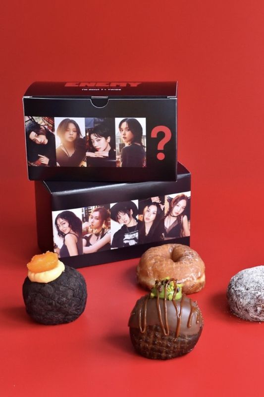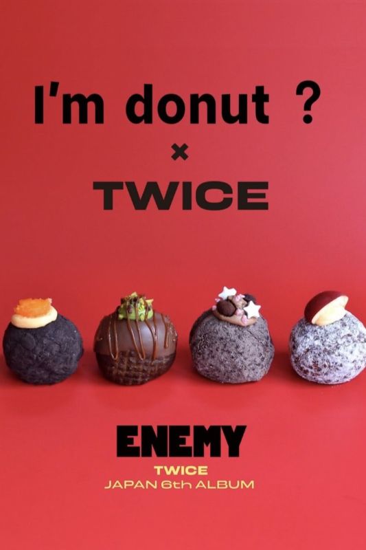 東京超人氣生甜甜圈品牌I'm donut?與韓國女團TWICE合作,以TWICE第六張日本原創專輯《ENEMY》為主題,推出4款口味甜甜圈及黑、白2款特製包裝盒,盒內附贈一張紀念聯名原創貼紙(9種款式隨機選擇),並另外提供一個全新包裝盒供粉絲收藏。