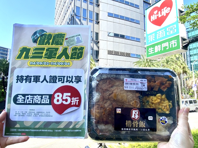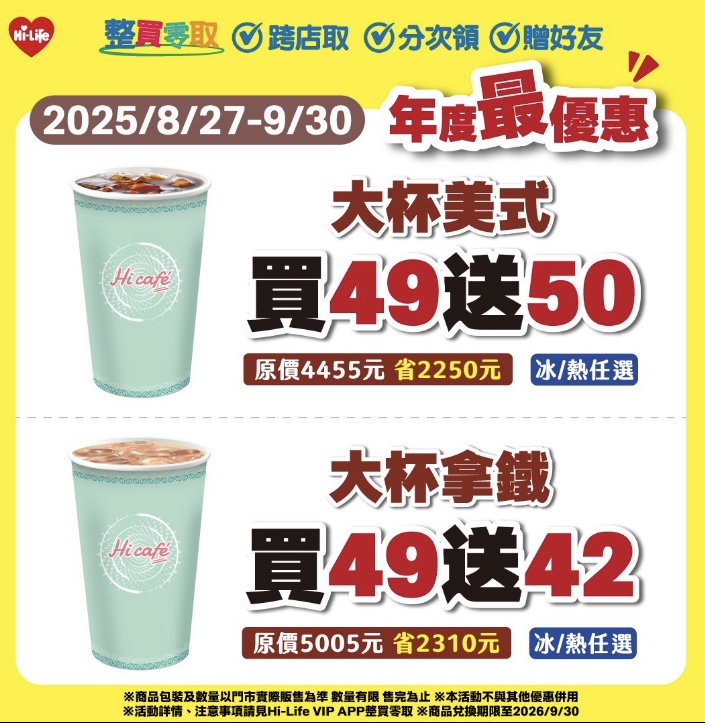 萊爾富除了有軍人身分指定商品享85折優惠以外,Hi café也同步祭出優惠,即日起至9月9日止,特大杯美式(原價60元)、特大杯拿鐵(原價70元)皆享同品項冰熱任選買1送1優惠。