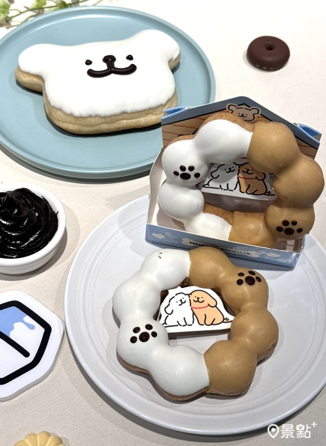 「汪!小狗貼貼波堤」將當紅波堤分別裹上白可可沾醬及伯爵奶茶可可沾醬,點上狗狗們的可愛腳印,並插上線條小狗相親相愛的插卡!