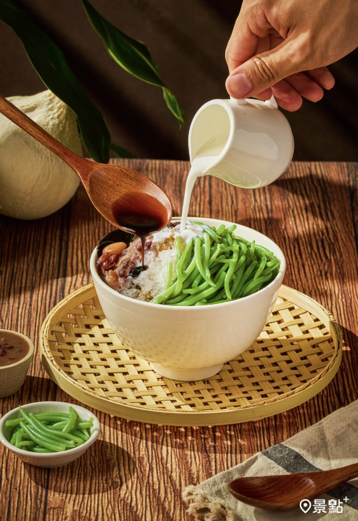 「煎蕊」是馬來西亞的傳統甜點冰品,也被稱作珍多,是以刨冰做為基底,加上溶入斑蘭葉汁而呈現玉綠色的涼粉條以及紅豆等食材,再淋上椰奶和祖傳三代的祕製糖漿,香氣濃郁、口感豐富,是檳城在地最著名的排隊小吃。