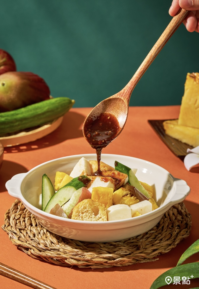 「羅惹」是Rojak的音譯,馬來文「混合、混搭」的意思,是一種混合蔬菜、水果的沙拉。將配料切塊,淋上以蝦醬、辣椒、羅望子、糖為基底的醬料,讓食材均勻裹上醬汁,再撒上碎花生、混合成一道平衡甜鹹酸辣的南洋料理。